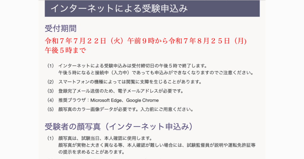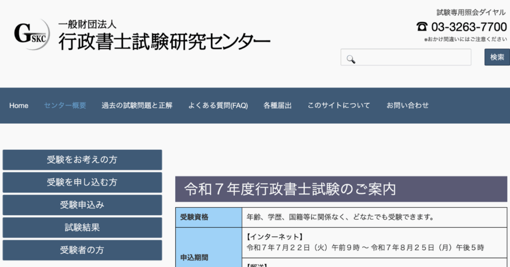 まず初めに、2025年度(令和七年度)の行政書士試験の申込み期間は、インターネット申込みの場合は「令和7年7月22日(火)午前9時から令和7年8月25日(月) 午後5時まで」。