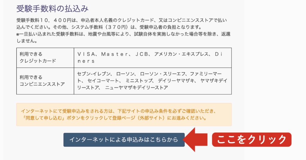 「インターネットによる受験申込み」を選択すると、上記画像のような画面に遷移するかと思います。