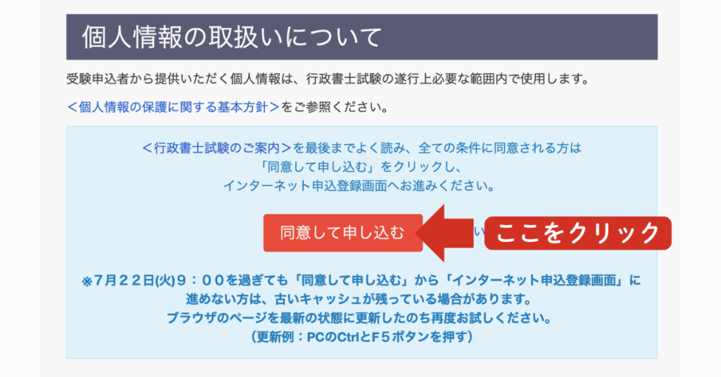 先ほどの「同意して申し込む」の赤いボタンをクリックして上記の画像のような画面に切り替わったら、左の「受験申込みはこちら」を選択します。