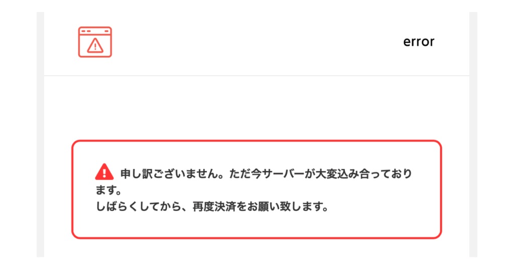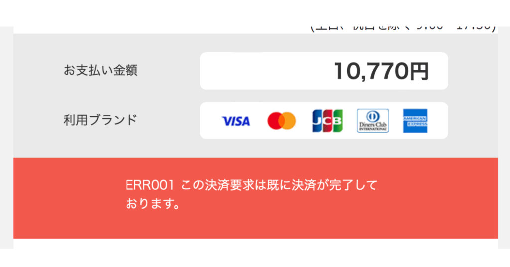 先ほどの画面で「お支払い」を選択後、画面の読み込みがあまりにも遅くページを更新してしまった結果、以下のような画面が表示される方もいるかと思います。