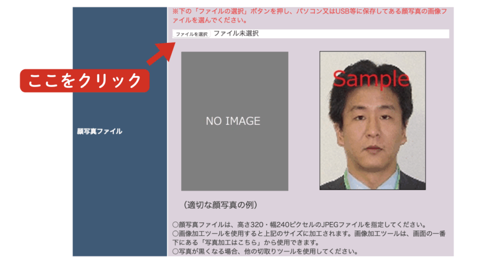 上記画像を参考に、「顔写真ファイル」の「ファイルを選択」から、先ほど撮影した写真を選んでください。