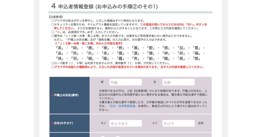 次に、「申込者情報」を登録していきます。30分でタイムアウトしてしまうので、スピーディーに入力していきましょう。